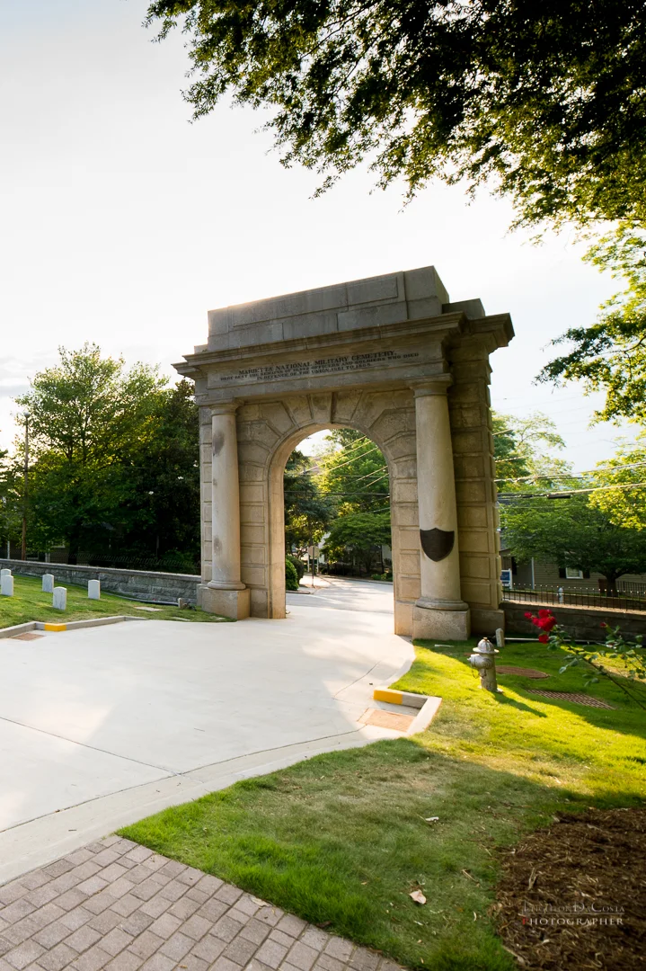 A granite memorial arch at the cemetery gate is inscribed: "Here rest the remains of 10,312 Officers and Soldiers who died in defense of the Union 1861-1865."